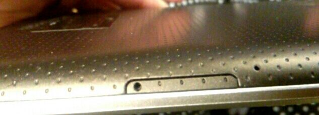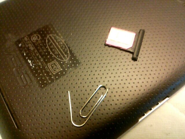 そこに付属のSIMトレー用のピンか、安全ピンかクリップの先っぽ使って穴に押し込むとトレーが開きます。