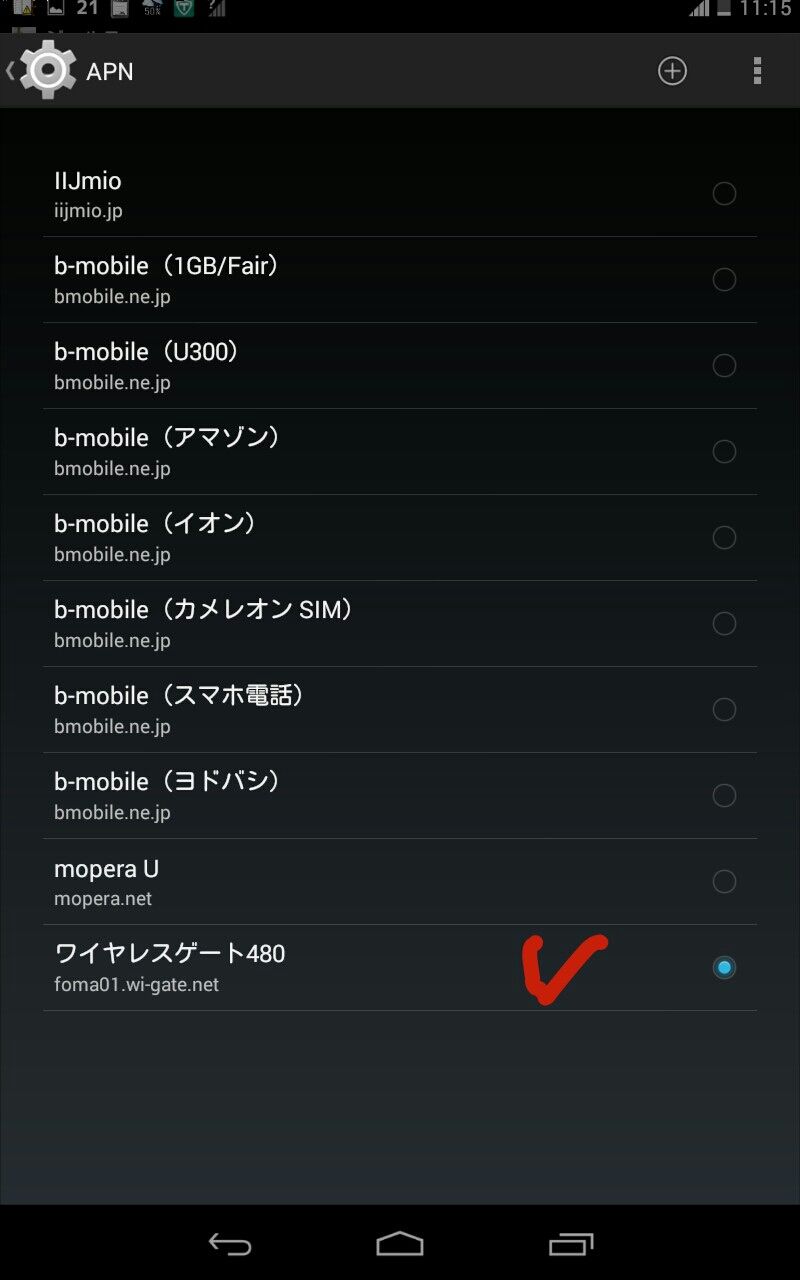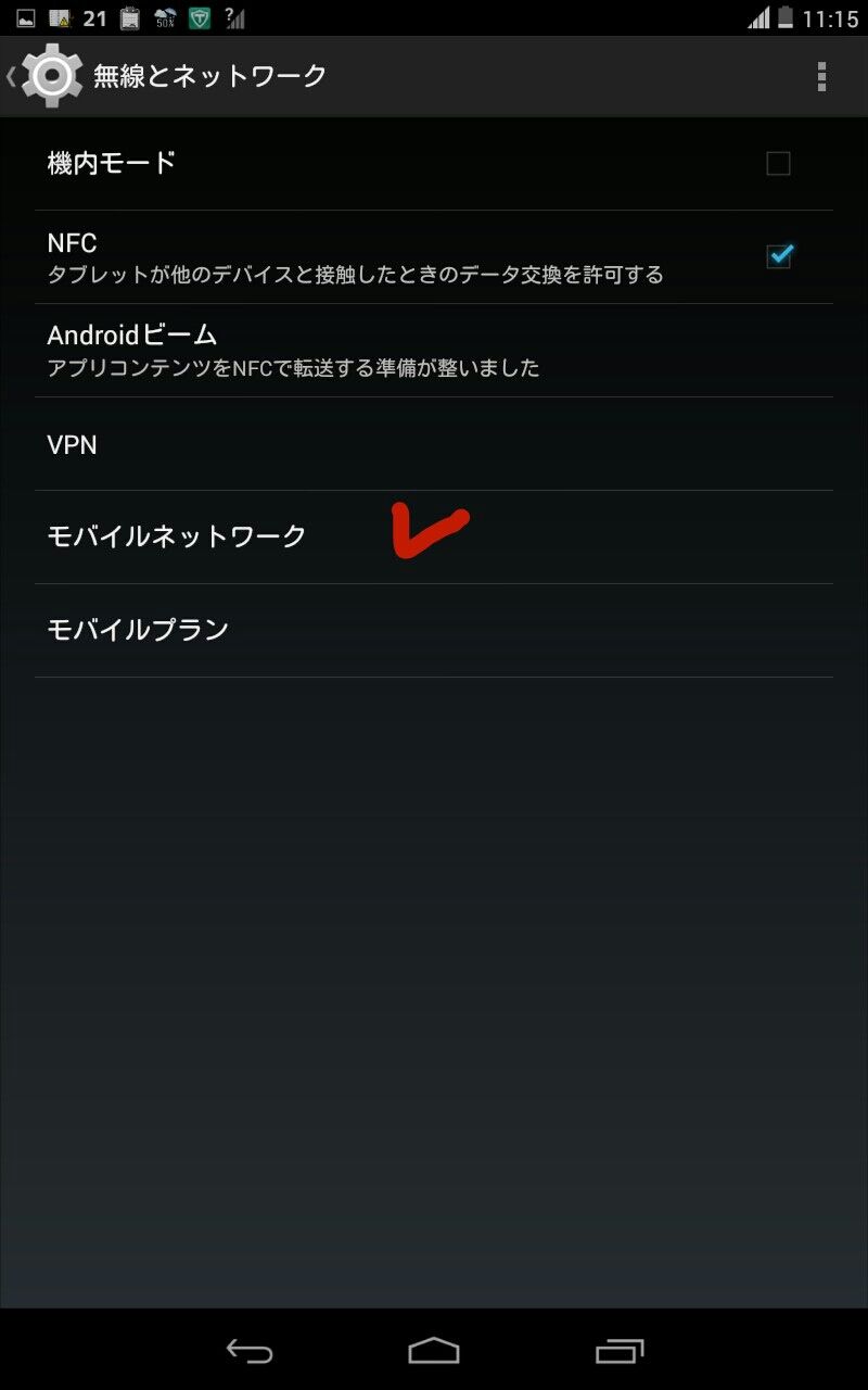 APN(access point network)の設定をしないと、どうやってつないでいいのかNexus7がわかりません。