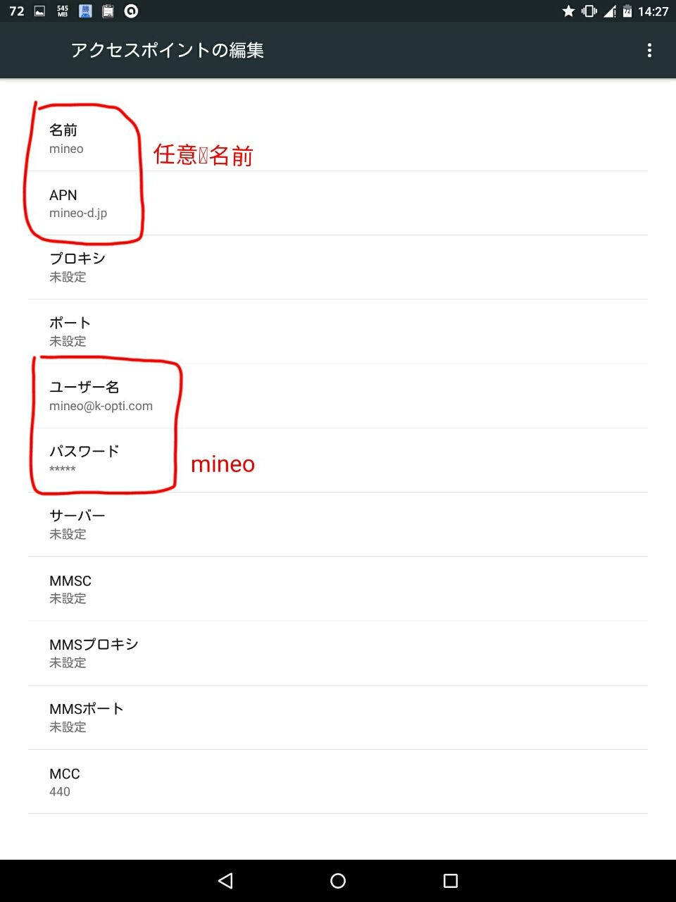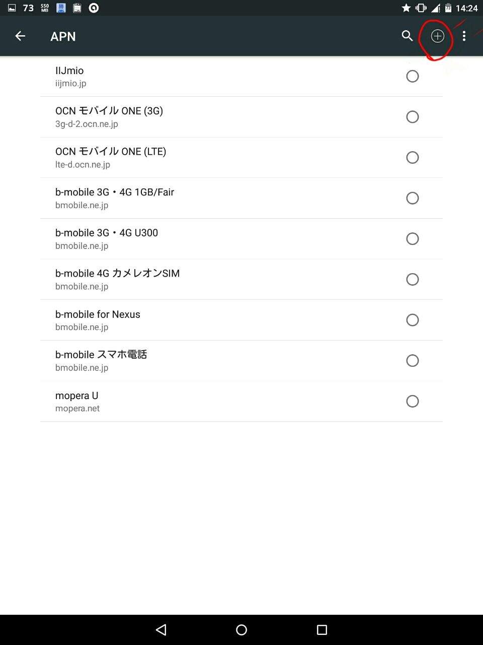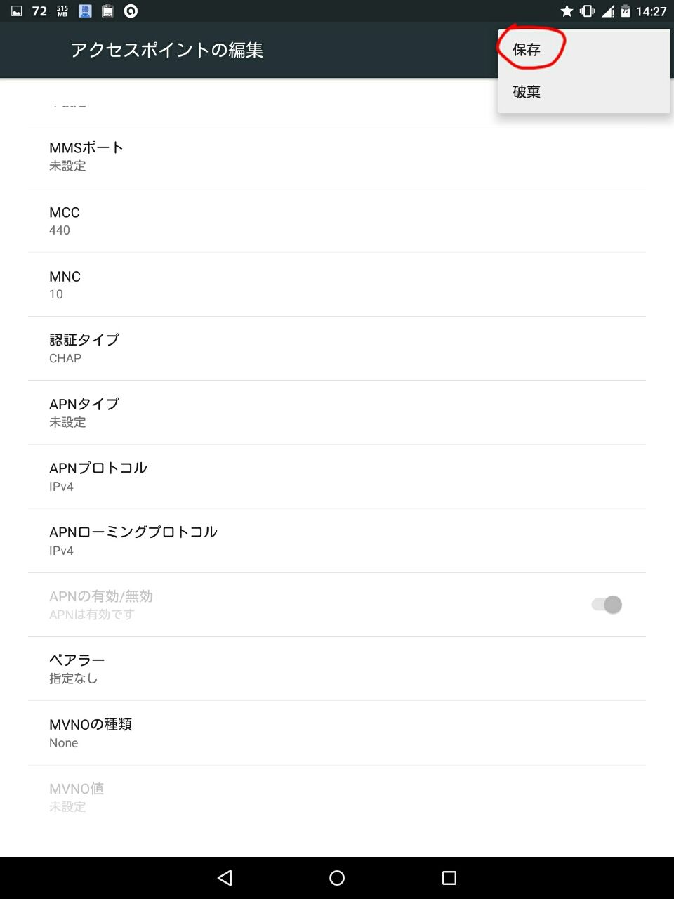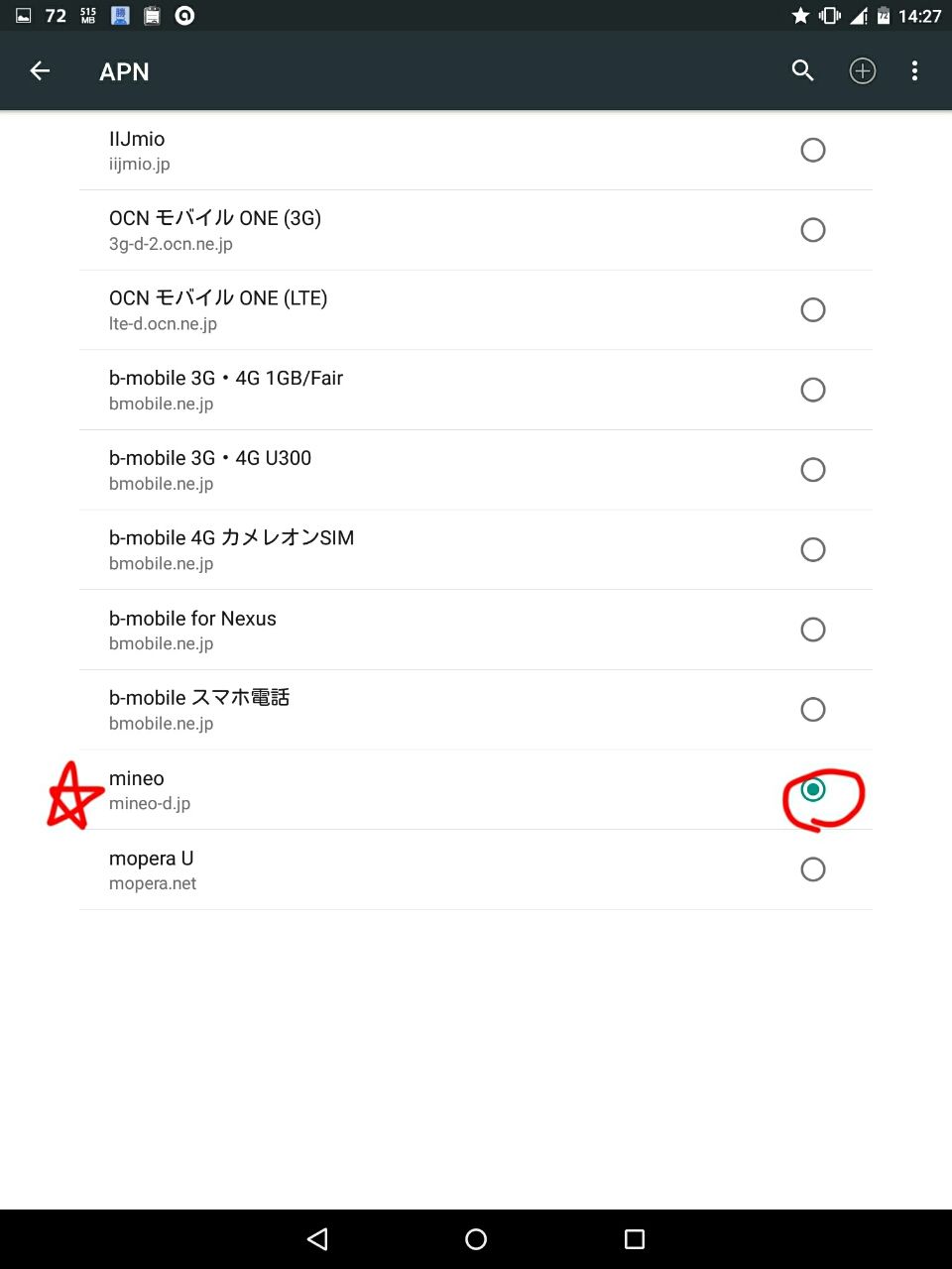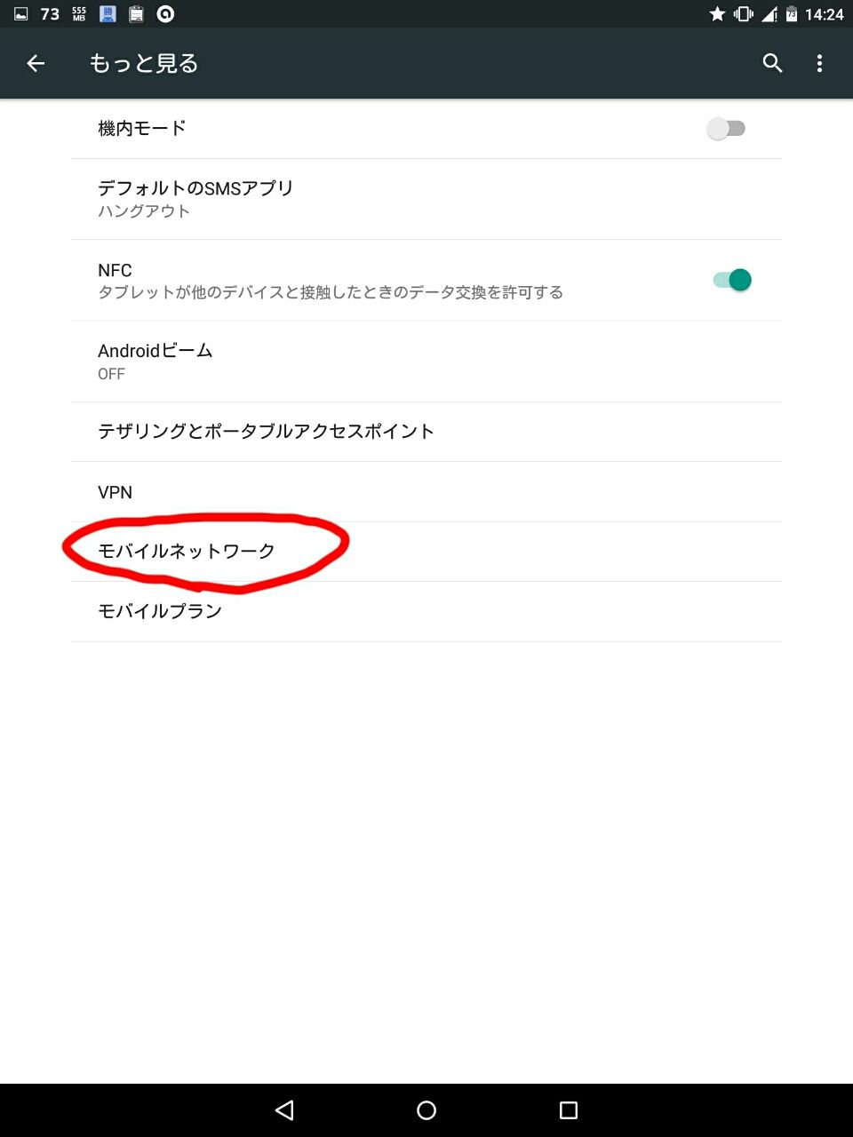 ↓設定→無線とネットワーク→もっと見る→モバイルネットワーク→アクセスポイント名→APN